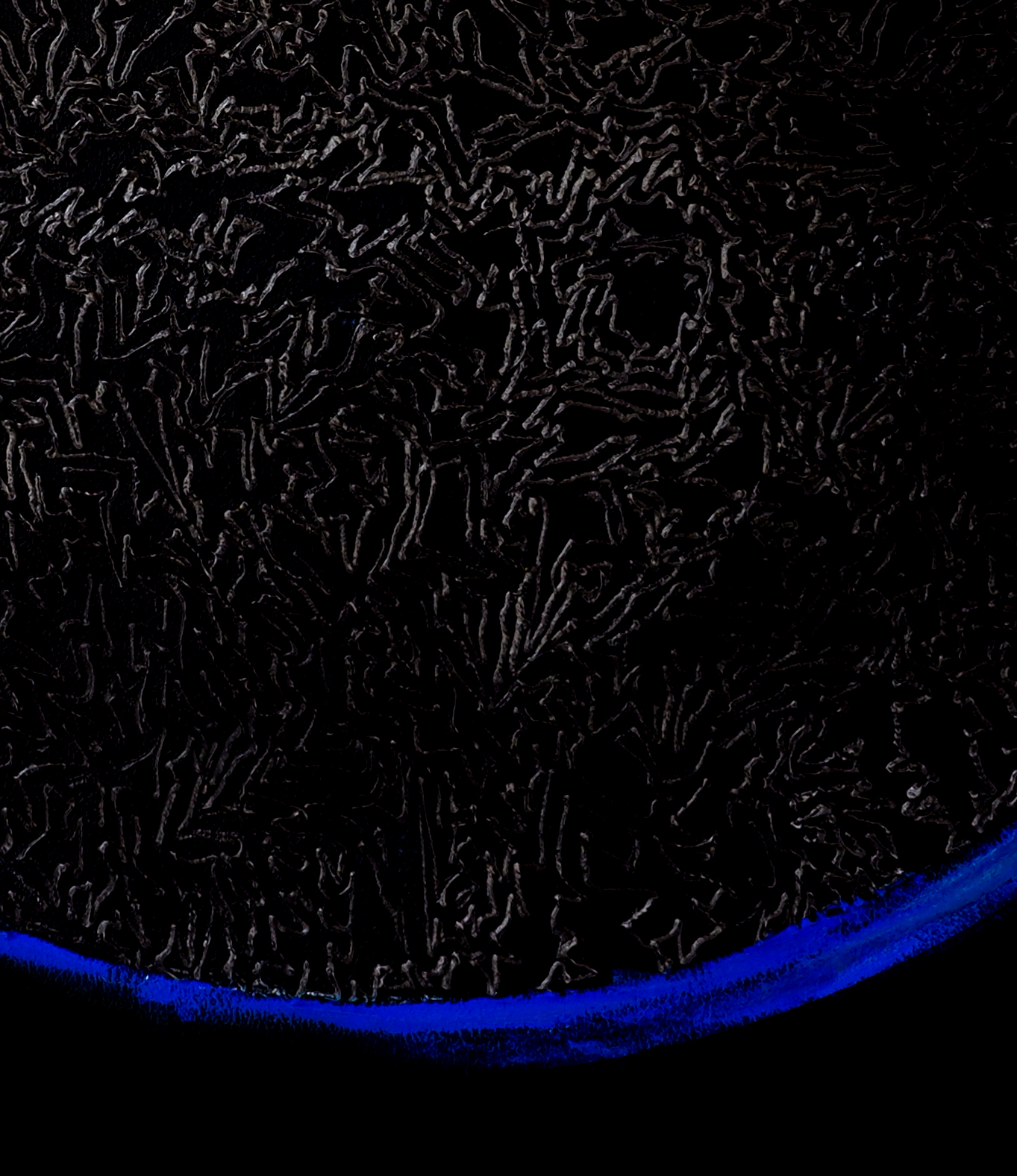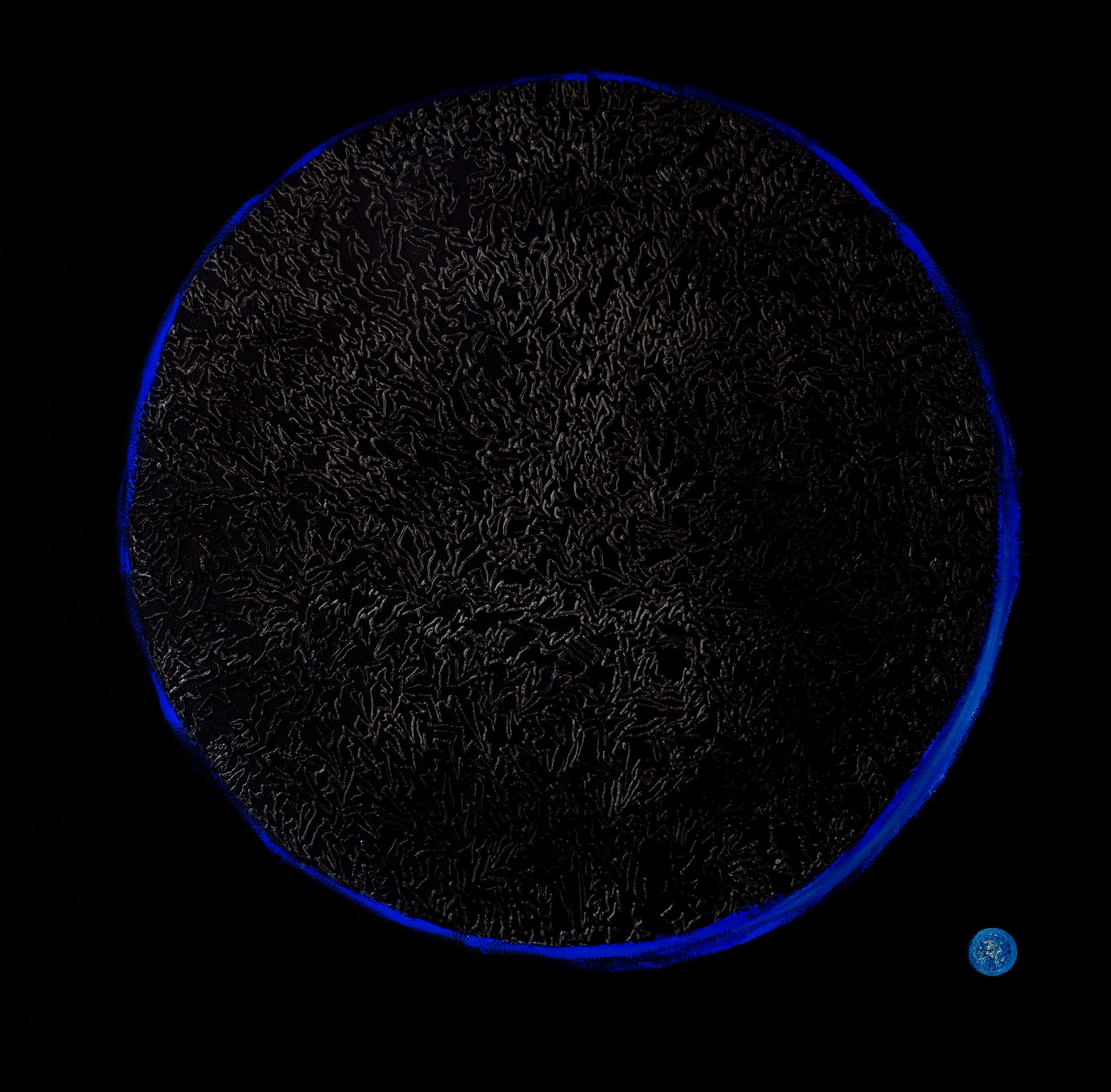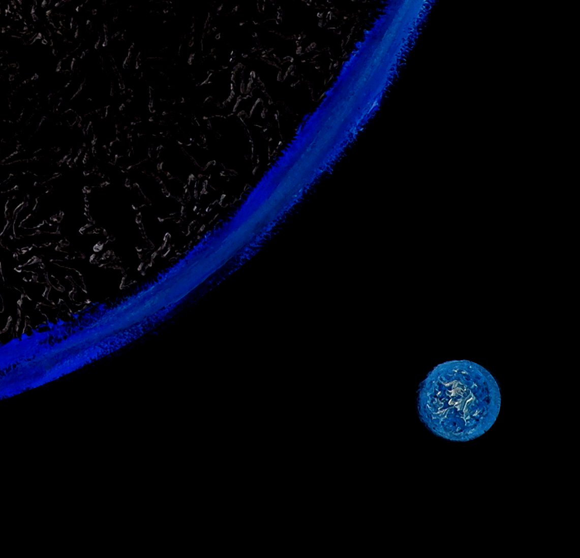 На небольшом, 80х80 см, формате я решил разместить простой геометрический образ спутника и Земли, неподалёку. Композиционно это незатейливо, однако, моя основная задача была наполнить Луну, а точнее её обратную сторону, энергией.